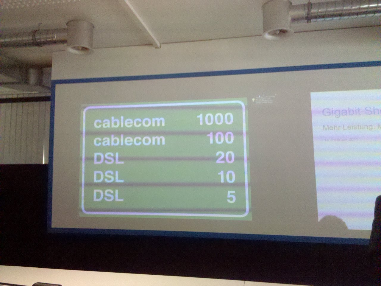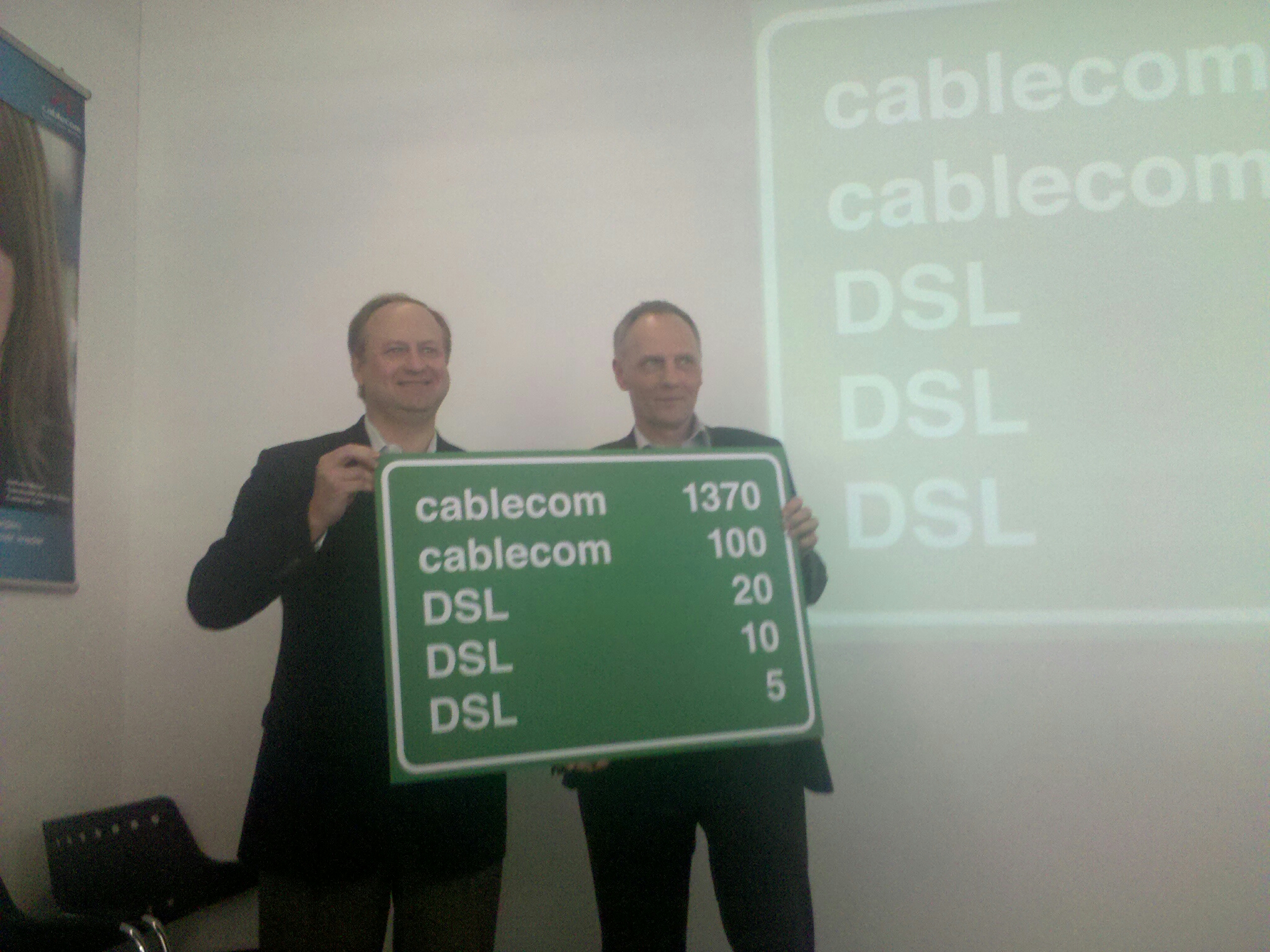 Heute lud die Cablecom zu einem Presse-Event, wo sie die Leistung ihres Kabelnetzes vorführen wollte. Schon heute kann man ja, an immer mehr Orten, Fiber Power 100 bestellen. Swisscom kann diese Leistung nur an sehr wenigen Orten liefern. Cablecom soll in den nächsten Monaten nochmals neue Gemeinden aufschalten.