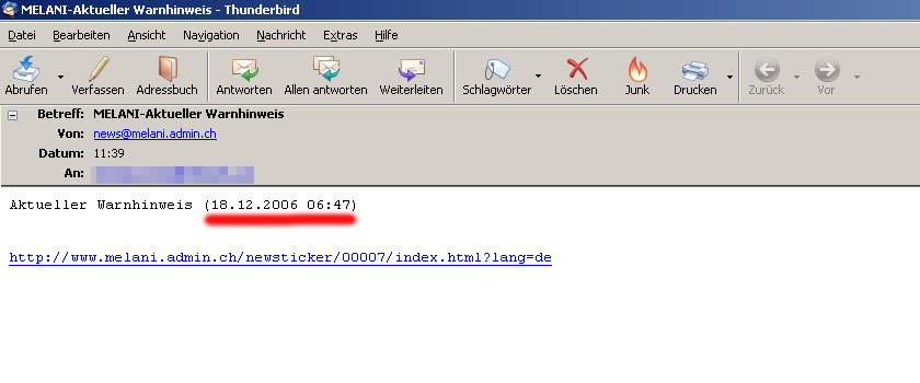 Auf meiner Business E-Mail Adresse habe ich den Newsletter von MELANI (Melde- und Analysestelle Informationssicherung) abonniert. Dieser soll über aktuelle IT-Bedrohungen informieren. Heute kam folgende Mail: