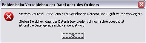 VMware legt gewisse temporäre Dateien im Profil des Benutzers ab, auch wenn dieser das Programm nicht benutzt. Die Rechte auf diese Dateien sind so gesetzt, dass nur der entsprechende Benutzer darauf Zugriff hat. Da ich mit einem anderen Benutzer eineloggt war, hatte ich natürlich keine Rechte auf die Datei.
